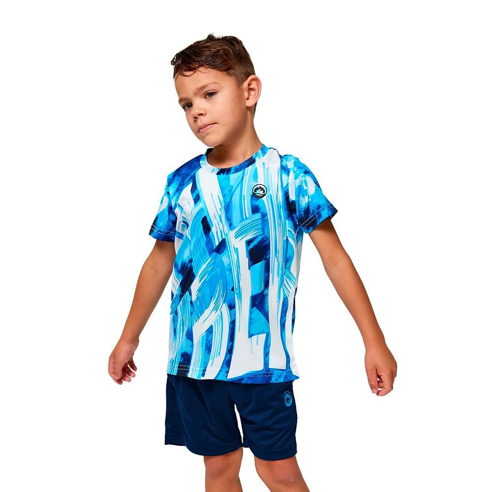El conjunto Grip en color azul presenta una camiseta con un diseño artístico en pinceladas azules sobre fondo blanco, que aporta una estética urbana y moderna. El contraste de colores crea un efecto visual llamativo y original que destaca en cualquier situación. Ideal para practicar cualquier deporte o para el día a día, gracias a su espalda transpirable que mejora la ventilación, y al pantalón con bolsillos, cintura elástica y cordón ajustable que garantiza libertad de movimiento. Composición 100% Poliéster.